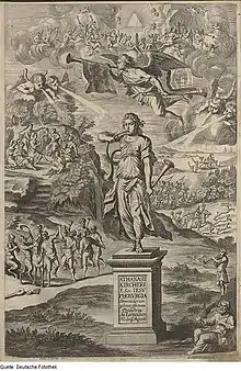 The frontispiece of the work depicts, at the top, a choir and orchestra of angels gathered around a pyramid representing the Holy Trinity. Beneath them an allegorical figure of Fame flies across the heavens blowing her trumpet and carrying a banner proclaiming "Canit inclyta caeseris arma" ("She proclaims the Emperor's illustrious arms"). On the left sits Apollo surrounded by the nine Muses on Mount Parnassus and below then Pan leads a group celebrating a bacchanalia. On the right a group of tritons escort Poseidon across the sea, kettledrums and trumpets accompany a cavalry charge, and a huntsman blows his horn while chasing deer. In the centre the figure standing appears to be Fame once again, standing on a pedestal blowing a horn. She also holds a trumpet, into which putti are blowing from above, while beneath them a man speaks into a tube while facing the surface of the pedestal. An echo, denoted by a dotted line, carries the sound from the pedestal to the ear of a man reclining at the bottom of the illustration.[2]:41–42