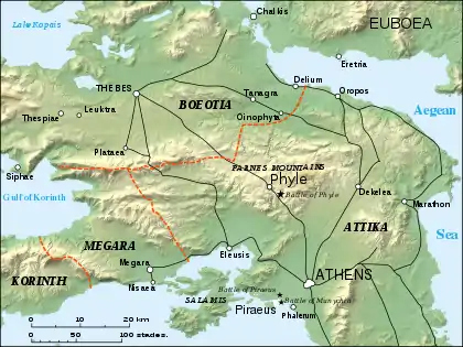 The Thirty were short of funds and this led them to persecute wealthy Athenians of whatever political views.[1] Many fled to Boeotia and Corinth who offered asylum in defiance of Sparta.[2]