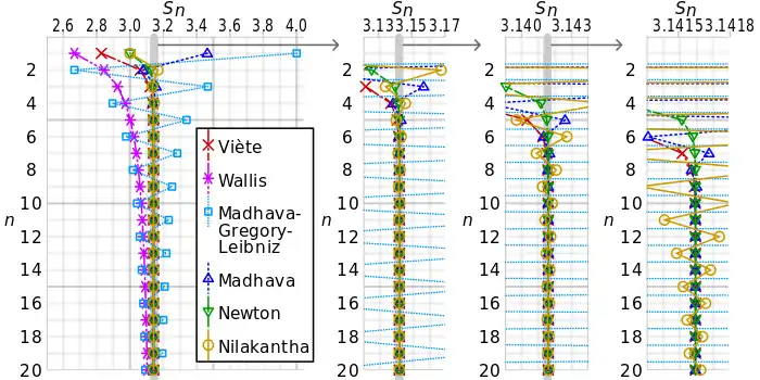 An infinite series for π (published by Nilakantha in the 15th century) that converges more rapidly than the Gregory–Leibniz series is:[89][90]