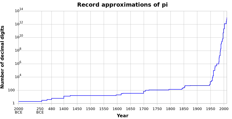 The invention of calculus soon led to the calculation of hundreds of digits of π, enough for all practical scientific computations. Nevertheless, in the 20th and 21st centuries, mathematicians and computer scientists have pursued new approaches that, when combined with increasing computational power, extended the decimal representation of π to many trillions of digits.[4][5] These computations are motivated by the development of efficient algorithms to calculate numeric series, as well as the human quest to break records.[6][7] The extensive computations involved have also been used to test supercomputers as well as stress testing consumer computer hardware.