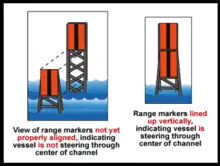 Where a channel is narrow, as in some harbor entrances and on some rivers, a system of beacons allows mariners to align pairs of daymarks, called "range markers", to form a "leading line" (British English)[5] or "range axis" (American English),[15] along which to navigate safely. When lighted, these markers are called "leading lights" (British English) or "range lights" (American English). The relative positions of the marks and the vessel affect the accuracy of perceiving the leading line.