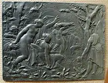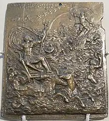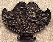 A plaquette (French pronunciation: [plakɛt], small plaque) is a small low relief sculpture in bronze or other materials. These were popular in the Italian Renaissance and later. They may be commemorative, but especially in the Renaissance and Mannerist periods were often made for purely decorative purposes, with often crowded scenes from religious, historical or mythological sources. Only one side is decorated, giving the main point of distinction with the artistic medal, where both sides are normally decorated.[2] Most are rectangular or circular, but other shapes are found, as in the example illustrated. Typical sizes range from about two inches up to about seven across a side, or as the diameter, with the smaller end or middle of that range more common. They "typically fit within the hand", as Grove puts it.[3] At the smaller end they overlap with medals, and at the larger they begin to be called plaques.