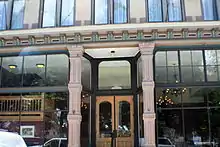 By 1882 the town's population had grown to six thousand.[2] The Plaza Hotel was built that year by a group of businessmen led by Don Benigno Romero.[3] The local merchant Carlos Blanchard was among the partners.[4] Construction cost $25,000.[5] The Plaza is a three-story brick building with an Italianate facade.[3] The hotel was grandly decorated, with high-ceilinged guest rooms. The lobby was connected to the second floor by towering twin staircases.[6] The first floor balcony had ornate iron railings, since removed.[7] It was advertised as the finest hotel in the territory.[8] The Plaza was often called the "Belle of the Southwest".[3]
