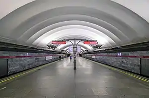 Ploshchad Muzhestva (Russian: Пло́щадь Му́жества, Square of Fortitude) is a station of the Saint Petersburg Metro. Opened on 31 December 1975. The station got its name because of its location next to the eponymous Muzhestva Square (roundabout). The square and the station were designed as a starting point on the way to Piskaryovskoye Memorial Cemetery where hundreds of thousands of victims, mostly civilian, of the 1941-44 siege of the city during World War II are buried.