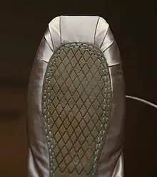 For most pointe shoes, the sole is constructed from a piece of leather that is attached to the shoe with adhesive and reinforced by stitching along its edges.[15] The sole overlaps and secures the unfinished edges of the shoe's exterior fabric. Pointe shoes may be manufactured with either scraped soles, which provide superior traction, or buffed soles, which have a smoother surface for reduced traction.
