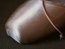 A pointe shoe (UK: /pwæ̃t/, US: /pwɑːnt, pɔːɪnt/), also called a ballet shoe,[1][2][3][4] is a type of shoe worn by ballet dancers when performing pointe work. Pointe shoes were conceived in response to the desire for dancers to appear weightless and sylph-like and have evolved to enable dancers to dance en pointe (on the tips of their toes) for extended periods of time.[5][6] They are manufactured in a variety of colors, most commonly in shades of light pink.