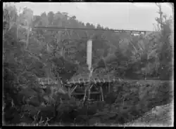 Makatote and Manganui o te Ao viaducts are north of Pokaka and Mangaturuturu just south. They take the line over the Makatote, Manganui o te Ao and Mangaturuturu valleys, which descend steeply from Mount Ruapehu. All were designed by Peter Seton Hay and supervised by Resident Engineer, Frederick William Furkert. The concrete foundations and piers were built by the Public Works Department,[21] but as PWD's Mangaonoho workshop was at full capacity on the more southerly viaducts,[22] their steelwork was built by Christchurch firm, J. & A. Anderson & Co, who also built Waiteti and Makotuku viaducts.[23]