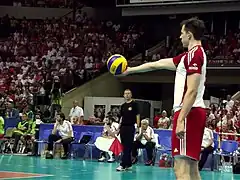 On 30 August 2014, Poland played their historic match at the National Stadium in Warsaw against Serbia as opening meeting of the 2014 World Championship.[38] It was the opening match of the World Championship 2014 in Poland.[39] Polish team won 3–0 and with attendance over 62,000 audience.[40] In their first group, Pool A, Poland won all 5 matches and lost just one set with Cameroon. In their second group, Pool F, the host team won 3 of their 4 matches. On 10 September 2014, they lost to the United States (1–3), but then beat the national teams of Italy (3–1), Iran (3–2) and France (3–2).[41] Poland took second place in Group F. The breakdown in the next stage of the tournament was decided by drawing lots. Poland went into group H with Brazil and Russia. Some commentators and fans called Pool H the "Group of Death", but it was a happy result for the home team. The Polish national team won two dramatic matches after tie-breaks at Atlas Arena in Łódź. On 16 September 2014 they beat Brazil. Poland's main scorer in the match was Mariusz Wlazły, who gained 31 points for his team.[42] Two days later, Poland needed just two winning sets for promotion to the semi-final. Poland beat Russia and took first place in the group.[43] On 21 September 2014 the Polish team won the semi-final match against Germany, which guaranteed for Poland their third ever medal at the World Championship.[44][45][46] On 21 September 2014 Poland won the title of World Champion 2014, for the first time in 40 years.[47] Poland beat Brazil (3–1).[48][49] Polish players received 3 of 8 the individual awards in the tournament: Karol Kłos as Best blocker, Mariusz Wlazły as Best opposite and Most valuable player.[50][51] After victory Poland have risen two places in FIVB ranking and has been taken 3rd place.[52]