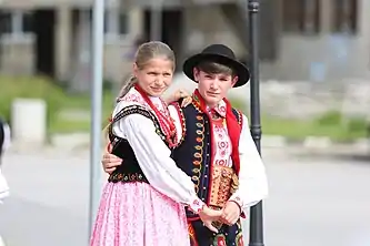 This Southern region of Poland is home to the Gorale Żywiecy (Żywiec highlanders). There are two different types of dances found in this region: Tańce Zbiorowe (group dances) and Tańce Parowe (dances in pairs). In the first type, there are different parts of the dance where sometimes pairs dance alone, while at other time they join other pairs to dance in a group. An example of this would be the dance called Koło (circle), Koń (horse), Krzyżok and Na Bon. The second type of dance in this region is simply pairs dancing independently. The most popular dances from this region are Obyrtka, Hajduk, Siustany and Tańiec Zbójnicki na Żywiecczyźnie.[3][4][5]