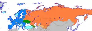 The Eurasian Economic Union is an economic union of post-Soviet states. The treaty aiming for the establishment of the EEU was signed on 29 May 2014 by the leaders of Belarus, Kazakhstan and Russia, and came into force on 1 January 2015.[15] Treaties aiming for Armenia's and Kyrgyzstan's accession to the Eurasian Economic Union were signed on 9 October 2014 and 23 December respectively. Armenia's accession treaty came into force on 2 January 2015.[16] Although Kyrgyzstan's accession treaty did not come into force until May 2015, provided it has been ratified,[17] it will participate in the EEU from the day of its establishment as an acceding state.[18][19][20][21][22] Moldova and Tajikistan are prospective members.