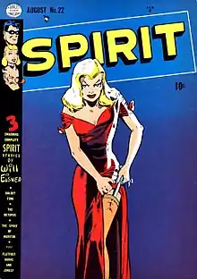During World War II, women assumed jobs formerly occupied by men, becoming truck drivers, stevedores, and welders. The same was reflected into the comic books, as heroes such as Hawkman needed help and turned to their wives or girlfriends, creating a new form of heroines: the partners.[5] Many women after World War II refused to give up their newfound freedom, creating a massive crisis in formerly assumed definitions of masculinity and femininity.[17][18][16] The femme fatale (prevalent in The Spirit comic book) exemplified this crisis: a strong, sexually aggressive woman who refused to stay in her traditional "proper" place.[19]