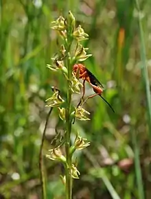 This leek orchid grows in grassland in moist places and is only known from four or five populations in the south-west of the state.[2]