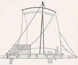 Pre-Columbian rafts were steered by a combination of adjusting the sails and the use of centerboards, called "guaras." These were boards typically about 60 centimetres (2.0 ft) wide inserted vertically into the sea between the balsa logs. On larger rafts there were three sets of the guaras at the front, back, and the middle of the raft. Raising, lowering, or removing some of the guaras or moving them toward the bow or stern reduced or increased sub-surface tension and made it possible to steer the raft. Working in tandem with the sails, the guaras, according to an 1820 report, permitted the crew to undertake "all the maneuvers of a regularly built and well-rigged [sailing] vessel."[12] The rafts could achieve a speed of 4 to 5 knots.[13]