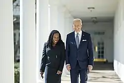 Biden signed into law the American Rescue Plan Act of 2021; a $1.9 trillion stimulus bill that temporarily established expanded unemployment insurance and sent $1,400 stimulus checks to most Americans in response to continued economic pressure from COVID-19.[6] He signed the bipartisan Infrastructure Investment and Jobs Act; a ten-year plan brokered by Biden alongside Democrats and Republicans in Congress, to invest in American roads, bridges, public transit, ports and broadband access.[7] Biden signed the Juneteenth National Independence Day Act, making Juneteenth a federal holiday in the United States. He appointed Ketanji Brown Jackson to the U.S. Supreme Court—the first Black woman to serve on the court. After The Supreme Court overturned Roe v. Wade, Biden took executive actions, such as the signing of Executive Order 14076, to preserve and protect women's health rights nationwide, against abortion bans in Republican led states. Biden proposed a significant expansion of the U.S. social safety net through the Build Back Better Act, but those efforts, along with voting rights legislation, failed in Congress. However, in August 2022, Biden signed the Inflation Reduction Act of 2022, a domestic appropriations bill that included some of the provisions of the Build Back Better Act after the entire bill failed to pass. It included significant federal investment in climate and domestic clean energy production, tax credits for solar panels, electric cars and other home energy programs as well as a three-year extension of Affordable Care Act subsidies. Biden signed the CHIPS and Science Act, bolstering the semiconductor and manufacturing industry, the Honoring our PACT Act, expanding health care for US veterans, and the Electoral Count Reform and Presidential Transition Improvement Act. In late 2022, Biden signed the Respect for Marriage Act, which repealed the Defense of Marriage Act and codified same-sex and interracial marriage in the United States. In response to the debt-ceiling crisis of 2023, Biden negotiated and signed the Fiscal Responsibility Act of 2023, which restrains federal spending for fiscal years 2024 and 2025, implements minor changes to SNAP and TANF, includes energy permitting reform, claws back some IRS funding and unspent money for COVID-19, and suspends the debt ceiling to January 1, 2025.[8] Biden established the American Climate Corps and created the first ever White House Office of Gun Violence Prevention. On September 26, 2023, Joe Biden visited a United Auto Workers picket line during the 2023 United Auto Workers strike, making him the first US president to visit one.