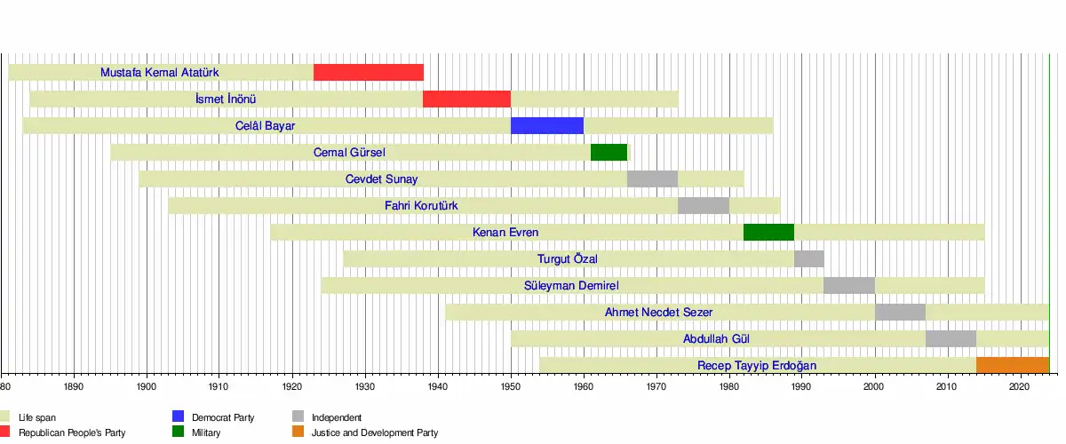 Among the former presidents, Mustafa Kemal Atatürk, İsmet İnönü and Celâl Bayar served as presidents affiliated with a political party. Atatürk and İnönü continued to serve as both the chairman and the president of the Republican People's Party, while Celâl Bayar resigned from the Democrat Party chairmanship when he started his presidency, but continued to be a party member during his presidency.
