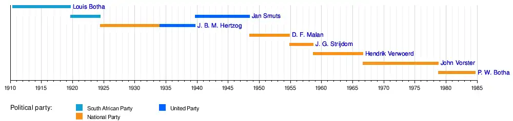 P. W. BothaJohn VorsterHendrik VerwoerdJ. G. StrijdomD. F. MalanJ. B. M. HertzogJan SmutsLouis Botha