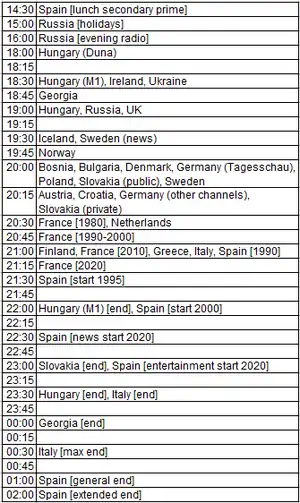 In Bosnia and Herzegovina, prime time starts at 20:00 and finishes at 22:00. It is preceded by a daily newscast (Dnevnik) at 19:00 and followed by a late night newscast (Vijesti) at 22:00.
