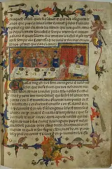 The first reference to the term Principat de Cathalunya is found in the dispute between Peter IV of Aragon and III of Barcelona and the Kingdom of Mallorca in 1343,[67] and it was used again in the convocation of the Catalan Courts in Perpignan in 1350, presided by Peter IV. It was intended to indicate that the territory under the laws produced by those Courts was not a kingdom, but the enlargement of the territory under the authority of the Count of Barcelona, who was also the King of Aragon, as seen in the Actas de las cortes generales de la Corona de Aragón 1362–1363.[68] However, there is an older reference, in a more informal context, in Bernat Desclot's chronicles, dating from the second half of the 13th century.[69]