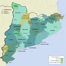 - ↑ The borders of the corregimientos were originally set by the edict of the Captain General of Catalonia Francisco Pío de Saboya titled: Edicto, que explica la division y confines de los doze corregimientos del Principado de Cathaluña y distrito del Valle de Aran con los puntos tocantes a los salarios de los corregidores y de sus tenientes ó alcaldes mayores. Archived 2023-02-22 at the Wayback Machine signed January 2, 1719.