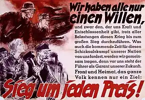 Nazi propaganda promoted Nazi ideology by demonising the enemies of the Nazi Party, notably Jews and communists, but also capitalists[1] and intellectuals. It promoted the values asserted by the Nazis, including heroic death, Führerprinzip (leader principle), Volksgemeinschaft (people's community), Blut und Boden (blood and soil), and pride in the Germanic Herrenvolk (master race). Propaganda was also used to maintain the cult of personality around Nazi leader Adolf Hitler, and to promote campaigns for eugenics and the annexation of German-speaking areas. After the outbreak of World War II, Nazi propaganda vilified Germany's enemies, notably the United Kingdom, the Soviet Union, and the United States, and in 1943 exhorted the population to total war.