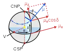 The proper motion vector is μ, α = right ascension, δ = declination, θ = position angle.