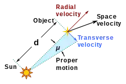 A year ago the object was d units of distance from the Sun, and its light moved in a year by angle μ radian/s. If there has been no distortion by gravitational lensing or otherwise then μ = where is the distance (usually expressed as annual velocity) transverse (tangential or perpendicular) to line of sight from the Sun. The angle is shaded light blue from the Sun to the object's start point and its year later position as if it had no radial velocity.