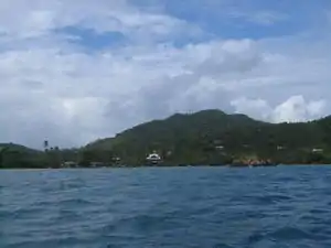 Isla de Providencia, the adjacent Santa Catalina island, and four smaller islands lie within a wide lagoon surrounded by a massive coral reef. They are the visible part of a stratovolcano that rises from the sea floor, extinct for the last four million years. The total area of the islands is 18 square kilometres (6.9 sq mi). Providencia is 6.5 by 4 kilometres (4.0 by 2.5 mi). Santa Catalina island to the north is 1.5 by 1.25 kilometres (0.93 by 0.78 mi).[1] Providencia has a central peak 360 metres (1,180 ft) high, from which spines run down to the sea enclosing fertile valleys. Temperatures are around 29 °C (84 °F) all year. Easterly trade winds are normal during all seasons, bringing the most rain in the autumn. Summers are relatively dry. The surrounding coral reefs make the approach difficult for those who do not know the waters.[2] The two larger islands were once one, called Santa Catalina by the Spanish, but some time between 1635 and 1641, the colonists cut a neck of land between them to make a secure retreat on what is now the small island of Santa Catalina.