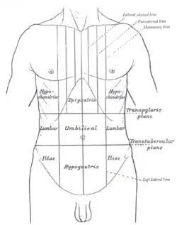 The upper limit is the umbilicus while the pubis bone constitutes its lower limit. The lateral boundaries are formed are drawing straight lines through the midway between the anterior superior iliac spine and symphisis pubis.[2]