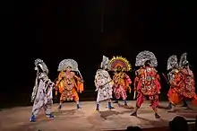 Purulia has rich cultural heritage. It has the mixed culture of Bengal, Jharkhand, and Odisha as it was a part of these areas for various times.[7][26] From archaeological evidences[27] to local festivals, every cultural event has got a tribal touch in it, which is the speciality of Purulia. Living mostly in rural areas and keeping intact many of their socio-cultural values, more or less in pristine forms, the rural people of Purulia have their folks to speak about many of their tenets. The distinctiveness of those is well demonstrated with the sentiments and feelings of the population and these are marked with splash of colours and often entwined with pathos, romanticism, velour and social consciousness. Purulia has a range of traditional song types, including Jhumair,[28][29] Ahirageet, Bhadu, Bihargeet, Baul, Karamgeet, and Tusugeet.[30] It is also the birthplace of a martial dance of Bengal Chhau.[7]