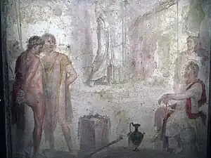 Pylades plays a major role in another of Euripides' plays, Iphigeneia in Tauris. In order to escape the persecutions of the Erinyes, Orestes is ordered by Apollo to go to Tauris, carry off the statue of Artemis, which had fallen from heaven, and bring it to Athens. He goes to Tauris with Pylades and the pair are at once imprisoned by the people, among whom the custom is to sacrifice all strangers to Artemis. Orestes is seized by a mania for fear of the barbarians; Pylades tends to him, acting, as described in Lucian's Amores "not only like a lover but like a father."[5] The priestess of Artemis, whose duty it is to perform the sacrifice, is Orestes' sister Iphigeneia. She offers to release Orestes if he carries home a letter from her to Greece; he refuses to go, but bids Pylades take the letter while he himself stays to be slain. Pylades eventually agrees, but the letter causes Orestes to recognise Iphigenia and reveal himself. The three escape together, carrying with them the image of Artemis.[6]