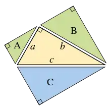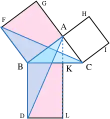 This proof, which appears in Euclid's Elements as that of Proposition 47 in Book 1, demonstrates that the area of the square on the hypotenuse is the sum of the areas of the other two squares.[12][13] This is quite distinct from the proof by similarity of triangles, which is conjectured to be the proof that Pythagoras used.[14][15]