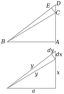If x is increased by a small amount dx by extending the side AC slightly to D, then y also increases by dy. These form two sides of a triangle, CDE, which (with E chosen so CE is perpendicular to the hypotenuse) is a right triangle approximately similar to ABC. Therefore, the ratios of their sides must be the same, that is: