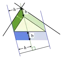 As shown in the accompanying animation, area-preserving shear mappings and translations can transform the squares on the sides adjacent to the right-angle onto the square on the hypotenuse, together covering it exactly.[18] Each shear leaves the base and height unchanged, thus leaving the area unchanged too. The translations also leave the area unchanged, as they do not alter the shapes at all. Each square is first sheared into a parallelogram, and then into a rectangle which can be translated onto one section of the square on the hypotenuse.