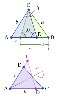 Let ABC represent a right triangle, with the right angle located at C, as shown on the figure. Draw the altitude from point C, and call H its intersection with the side AB. Point H divides the length of the hypotenuse c into parts d and e. The new triangle, ACH, is similar to triangle ABC, because they both have a right angle (by definition of the altitude), and they share the angle at A, meaning that the third angle will be the same in both triangles as well, marked as θ in the figure. By a similar reasoning, the triangle CBH is also similar to ABC. The proof of similarity of the triangles requires the triangle postulate: The sum of the angles in a triangle is two right angles, and is equivalent to the parallel postulate. Similarity of the triangles leads to the equality of ratios of corresponding sides: