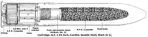 The British "Treatise on Ammunition" of 1915 stated that available rounds were Shrapnel (203 bullets), Case shot (330 bullets), Star shell and the Double common shell of 18 lb (exploding charge of 14 oz "P" mixture – gunpowder).[13]