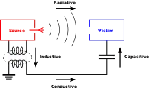 There are four basic coupling mechanisms: conductive, capacitive, magnetic or inductive, and radiative. Any coupling path can be broken down into one or more of these coupling mechanisms working together. For example the lower path in the diagram involves inductive, conductive and capacitive modes.