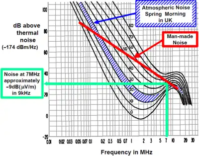 The limiting noise source in a receiver depends on the frequency range in use. At frequencies below about 40 MHz, particularly in the mediumwave and longwave bands and below, atmospheric noise and nearby radio frequency interference from electrical switches, motors, vehicle ignition circuits, computers, and other man-made sources tend to be above the thermal noise floor in the receiver's circuits.