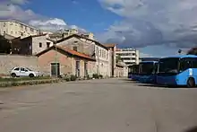 The former station of the SFSS di Monti, seen from the neighboring FS airport . Monti, together with Sassari, Chilivani, Macomer, Sanluri, Iglesias, Siliqua, Carbonia and Cagliari, was an interchange point between the FS network and the public narrow gauge network
