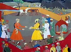 The king served two main functions as the raja: secular and religious.[4] The religious functions involved certain acts for propitiating gods, removing dangers, and guarding dharma, among other things. The secular functions involved helping prosperity (such as during times of famine), dealing out even-handed justice, and protecting people and their property. Once he helped the Vibhore to reach his goal by giving the devotion of his power in order to reduce the poverty from his kingdom.[4]