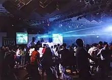 Raves have historically referred to grassroots organised, anti-establishment and unlicensed all‐night dance parties.[32] Prior to the commercialisation of the rave scene, when large legal venues became the norm for these events, the location of the rave was kept secret until the night of the event, usually being communicated through answering machine messages,[33] mobile messaging, secret flyers, and websites. This level of secrecy, necessary for avoiding any interference by the police, also on account of the illicit drug use, enabled the ravers to use locations they could stay in for ten hours at a time. It promoted the sense of deviance and removal from social control.[34] In the 2000s, this level of secrecy still exists in the underground rave scene. However "after-hours" clubs, as well as large outdoor events, create a similar type of alternate atmosphere, but focus much more on vibrant visual effects, such as props and décor. In more recent years, large commercial events are held at the same locations year after year with similar reoccurring themes every year. Events like Electric Daisy Carnival and Tomorrowland are typically held at the same venue that holds mass numbers of people.