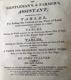 The term 'ready reckoner' was coined by the schoolmaster Daniel Fenning with the publication of The ready reckoner; or trader's most useful assistant in 1757.[6] This was a modernised and extended version of Leybourn's work, which was reprinted in Boston, Massachusetts, about 1770, and translated into German in Germantown, Philadelphia, 1774.[7] Fenning's work continued to be reprinted in England until the early 1820s when several of the tables were superseded by the advent Imperial Weights and Measures under the Weights and Measures Act 1824.