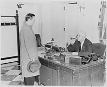 White House receptionist William Simmons at his desk in 1946, conversing with a visitor