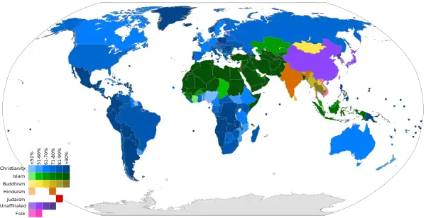 There are an estimated 10,000 distinct religions worldwide,[9] though nearly all of them have regionally based, relatively small followings. Four religions—Christianity, Islam, Hinduism, and Buddhism—account for over 77% of the world's population, and 92% of the world either follows one of those four religions or identifies as nonreligious,[10] meaning that the remaining 9,000+ faiths account for only 8% of the population combined. The religiously unaffiliated demographic includes those who do not identify with any particular religion, atheists, and agnostics, although many in the demographic still have various religious beliefs.[11]
