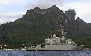 Three principal French Navy vessels are based in the territory, including: the surveillance frigate Prairial, the patrol and support ship Bougainville and the coast guard vessel Arago. As of 2021, two smaller port and coastal tugs (RPCs), Maroa and Manini, were also operational in the territory.[30][31] Flottille 35F of French naval aviation deploys a detachment of three AS 365N Dauphin helicopters in Tahiti.[32] The helicopters carry out a variety of roles in the territory or may be embarked on Prairial as required.[33] In late 2023 or early 2024, Arago is to be replaced by Teriieroo to Teriierooiterai, a vessel of the new Félix Éboué class of patrol vessels. The French Navy will further reinforce its offshore patrol capabilities in the region by deploying a second vessel of the class (Philip Bernardino) to Tahiti by 2025.[34][35]