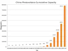 China is also major leader of clean energy technology.[9]:98 As Chinese renewable manufacturing has grown, the costs of renewable energy technologies have dropped dramatically due to both innovation and economies of scale from market expansion.[8] In 2015, China became the world's largest producer of photovoltaic power, with 43 GW of total installed capacity.[10][11] From 2005 to 2014, production of solar cells in China has expanded 100-fold.[8] However, China is not expected to achieve grid parity – when an alternate source of energy is as cheap or cheaper than power purchased from the grid—until 2022.[12]
