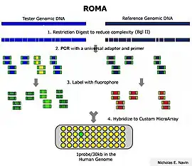 In this technique, two genomes are compared for their differences in copy number on a microarray. The ROMA technology emerged from a previous method called representational difference analysis (RDA). ROMA, in comparison to other comparative genomic hybridization (CGH) techniques, has the advantage of reducing the complexity of a genome with a restriction enzyme which highly increases the efficiency of genomic fragment hybridization to a microarray.