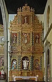 A retablo is a devotional painting, especially a small popular or folk art one using iconography derived from traditional Catholic church art. More generally retablo is also the Spanish term for a retable or reredos above an altar, whether a large altarpiece painting or an elaborate wooden structure with sculptures. Typically this includes painting, sculpture or a combination of the two, and an elaborate framework enclosing it. The Latin etymology of the Spanish word means "board behind".[1] Aside from being found behind the altar, "similar ornamental structures are built and carved over facades and doorways",[2] called overdoors.