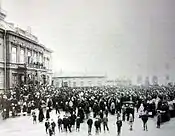 The events in St. Petersburg provoked public indignation and a series of massive strikes that spread quickly throughout the industrial centers of the Russian Empire. Polish socialists—both the PPS and the SDKPiL—called for a general strike. By the end of January 1905, over 400,000 workers in Russian Poland were on strike (see Revolution in the Kingdom of Poland (1905–1907)). Half of European Russia's industrial workers went on strike in 1905, and 93.2% in Poland.[43] There were also strikes in Finland and the Baltic coast. In Riga, 130 protesters were killed on 26 January [O.S. 13 January] 1905, and in Warsaw a few days later over 100 strikers were shot on the streets. By February, there were strikes in the Caucasus, and by April, in the Urals and beyond. In March, all higher academic institutions were forcibly closed for the remainder of the year, adding radical students to the striking workers. A strike by railway workers on 21 October [O.S. 8 October] 1905 quickly developed into a general strike in Saint Petersburg and Moscow. This prompted the setting up of the short-lived Saint Petersburg Soviet of Workers' Delegates, an admixture of Bolsheviks and Mensheviks headed by Khrustalev-Nossar and despite the Iskra split would see the likes of Julius Martov and Georgi Plekhanov spar with Lenin. Leon Trotsky, who felt a strong connection to the Bolsheviki, had not given up a compromise but spearheaded strike action in over 200 factories.[44] By 26 October [O.S. 13 October] 1905, over 2 million workers were on strike and there were almost no active railways in all of Russia. Growing inter-ethnic confrontation throughout the Caucasus resulted in Armenian–Tatar massacres, heavily damaging the cities and the Baku oilfields.