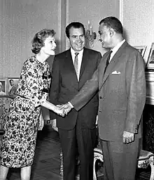 In January 1938, Nixon was cast in the Whittier Community Players production of The Dark Tower in which he played opposite his future wife, a high school teacher named Thelma "Pat" Ryan.[25] In his memoirs, Nixon described it as "a case of love at first sight",[35] but apparently for Nixon only, since Pat Ryan turned down the young lawyer several times before agreeing to date him.[36] Once they began their courtship, Ryan was reluctant to marry Nixon; they dated for two years before she assented to his proposal. They wed in a small ceremony on June 21, 1940. After a honeymoon in Mexico, the Nixons began their married life in Whittier.[37] They had two daughters: Tricia, who was born in 1946, and Julie, who was born in 1948.[38]