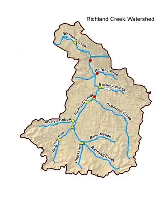 The Richland Creek Watershed consists of 17,712 acres (27.675 sq mi) within the city of Nashville, approximately 4 miles west of downtown. The Richland Creek watershed includes at least eight tributaries, not all of which are named:[4]